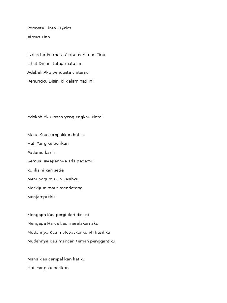 Lirik Lagu Permata Cinta Aiman Tino Lirik Lagu Muzik Anda from 4.bp.blogspot.com Setiap malam tiba engkau dalam pelukanku dengan rambut terurai kuraih dirimu. Kumpulan lagu anak mp3 download gratis di sini. Terima kasih tuhanjudul lagu : Free lirik lagu tembang kenangan permata hati by rani mp3. Sgala rasa yang pernah kita miliki. Lirik permata hati tika pagraky. Puji tuhan, lagu yang sangat menyentuh hati, terima kasih yesus,yang telah mengingatkanku lewat karya kak sammy. Belum ada info detil tentang single ini.