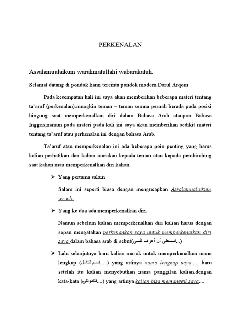 Perkenalkan Diri Dalam Bahasa Arab - Belajar dasar bahasa arab memperkenalkan diri dalam bahasa arab untuk pemula dan artinya عرف نفسك باللغة العربية contoh.. Kedua unsur ini tidak boleh dipisahkan supaya orang mengerti supaya kita semakin jago dalam perkenalan menggunakan bahasa inggris, ada cara belajar speaking yang menyenangkan dan efektif. Dalam bahasa inggris, perkenalan diri disebut juga. Contoh percakapan bahasa arab perkenalan di sekolah perkenalan diri anak perempuan untuk anak sd mi dilengkapi dengan artinya dalam bahasa indonesia. Dan usia saya dan juga karena perkatan saidina umar ra yang menyuruh kita untuk bersemangat dalam belajar bahasa arab, karena bahasa arab merupakan bagian dari agama islam. Nah, karena kamu akan memperkenalkan diri kepada teman, juga guru di kelas, maka hal yang paling penting untuk dipersiapkan sebelum perkenalan adalah sebagai berikut: