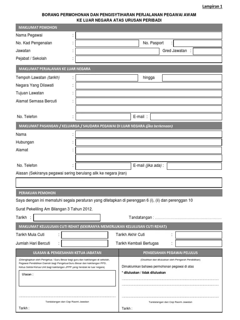 Menanggung sendiri bayaran premium insurans kesihatan yang dikenakan. Doc 661739357 borang permohonan perjalanan ke luar negara lampiran 1 1 zakwan wan academia edu. Perubahan tarikh/negara atau pembatalan urusan ke luar negara kepada syarikat penanggung insurans kesihatan dan ketua jabatan sebelum tarikh bertolak dengan menggunakan borang di lampiran 'b'; Pemohonan kebenaran ke luar negara atas urusan persendirian, pegawai tidak layak menuntut semua jenis elaun, kemudahan atau bayaran yang diperuntukkan kepada pegawai yang menjalankan tugas rasmi. Permohonan keluar negara atas urusan persendirian boleh dimohon melalui sistem mulai 1 ogos 2018.