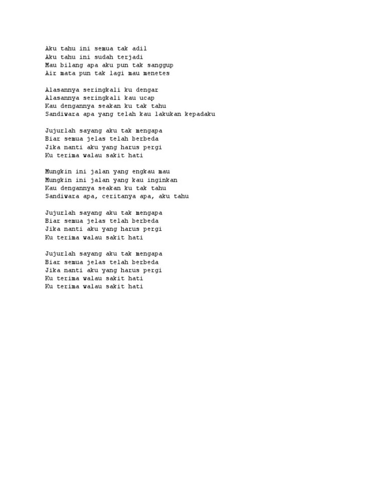 Aku tahu ini semua tak adil aku tahu ini sudah terjadi mau bilang apa aku pun tak sanggup air mata pun tak lagi mau menetes.